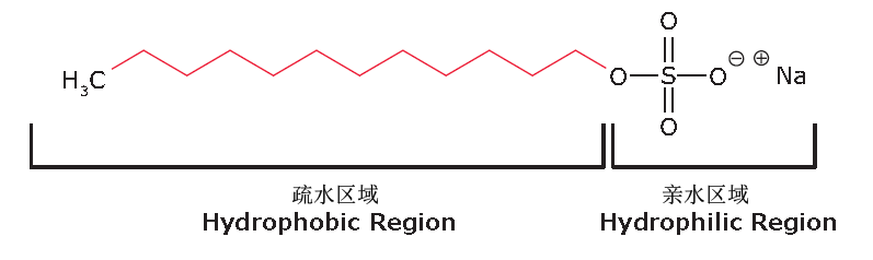 圖1 陰離子去污劑十二烷基硫酸鈉(SDS)的結構,其中顯示了親水和疏水區域