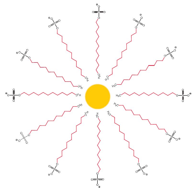 在膠束中,每個去污劑分子的極性親水區域朝向極性溶劑(水),而疏水區域形成熱力學穩定的疏水核。圖2為膠束簡圖,其解釋了膠束的方向概念。真實的膠束結構更復雜、更動態,并且可能隨去污劑濃度和溶液組成而變化。
