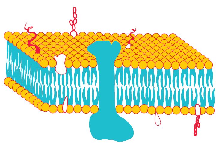 生物膜由磷脂構成,磷脂含有兩個疏水基團以及與之相連的一個極性頭部。這種分子結構使磷脂能夠組裝成脂質雙分子層,其中疏水鏈面向彼此,而極性頭部朝向外側的水溶液環境(圖3)。蛋白質和脂質鑲嵌在這個雙層結構中,形成流動鑲嵌模型(圖4),該模型于1972年由Singer和Nicolson首次提出。脂質尾部與疏水蛋白質區域之間的疏水相互作用使蛋白質保留在脂質雙分子層中。這些內在膜蛋白(IMP)(圖4)不溶于水溶液,因為它們聚集在一起可保護其疏水區域;但它們可溶于去污劑,因為去污劑形成的膠束與生物膜雙分子層具有相似的結構。