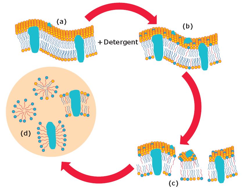 圖5.去污劑溶解生物膜的三個階段。當向生物膜中加入低濃度去污劑時(a),去污劑單體(紅色線條,帶單尾)分散至脂質雙分子層中而擾亂膜結構(b)。當濃度等于或高于去污劑的CMC時,脂質雙分子層中的去污劑分子飽和并分裂,產生脂質-蛋白質-去污劑混合膠束(c)。去污劑/蛋白質比率約為1-2(w/w)被認為足以溶解IMP,以形成脂質-蛋白質-去污劑混合膠束。去污劑濃度進一步增加會導致脂質-蛋白質-去污劑混合膠束逐漸脫脂,形成脂質/去污劑和蛋白質/去污劑混合膠束(d)。復合物中溶解的IMP與去污劑結合,產生蛋白質-去污劑復合物(PDC)。通常,去污劑/蛋白質比率約為10 (w/w)或更高時,將導致完全脫脂。