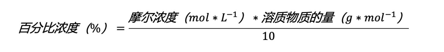 摩爾濃度(物質(zhì)的量濃度)定義為溶液中溶質(zhì)物質(zhì)的量除以溶液(混合物)的體積,單位M=mol×L-1。采用如下公式可根據(jù)摩爾濃度稀釋溶液: